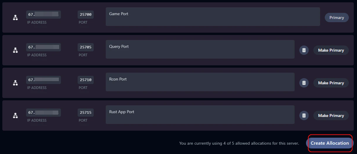 Navigate to your Rust server, then go to the Network page in the sidebar. On the Network page you can create port allocations which will assign ports to your server. You'll need to allocate three extra ports for the purposes mentioned above.