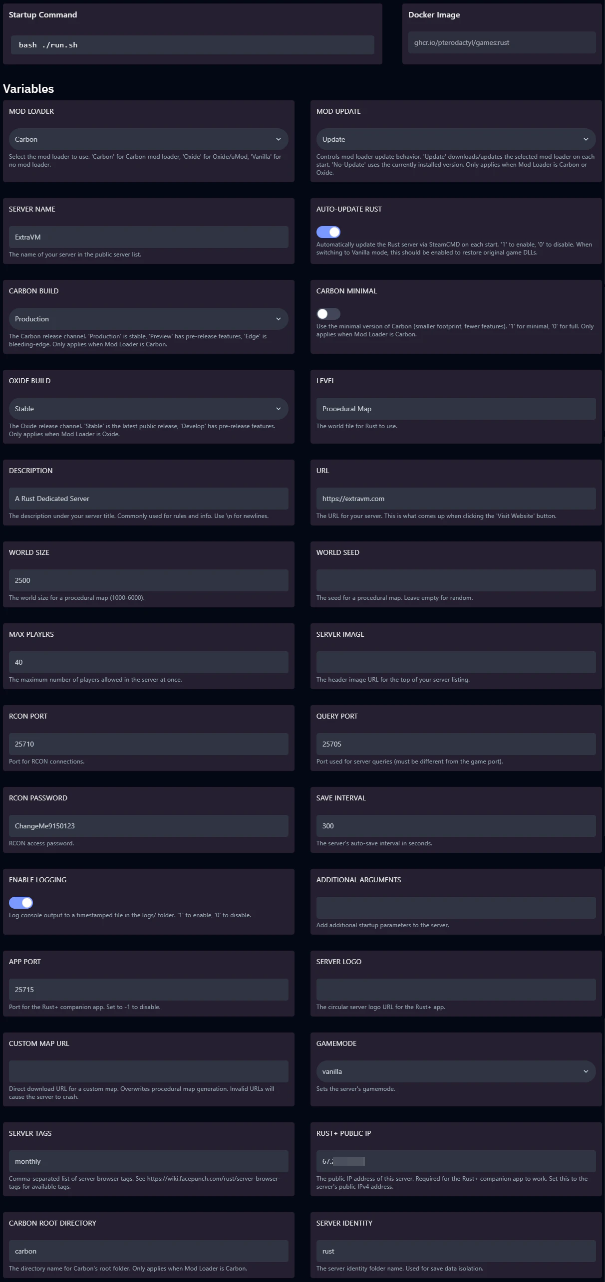 • "RUST+ PUBLIC IP" - (Important) Set the public IP address for the Rust+ companion app to work. This is the IP address of your game server on the main server page, without the port after it.